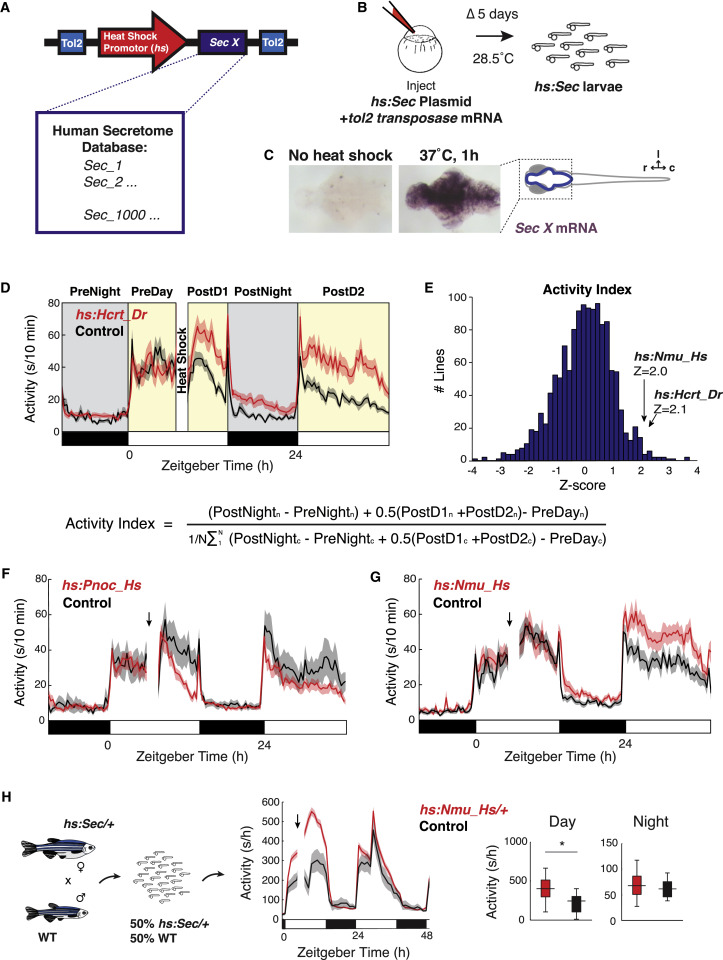 研究人员在在斑马鱼的幼虫中,过度表达了一千个不同的人类基因,每次一个,以探究它们对睡眠/觉醒周期的影响。斑马鱼被设计为,当放在37摄氏度的温水中时,会增加它们人类基因的表达,这使得研究小组能够在任何一个点上打开基因,并追踪动物睡眠模式的变化。