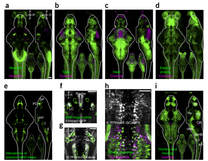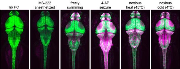 钙成像方法几乎可以在斑马鱼幼鱼全脑范围内成像,但该操作需固定其头部和行为以便在显微镜下进行观察。最近开发的CaMPARI(之前介绍过)可以记录自由游动的鱼的活动,但需要通过强光紫外线的扰动来刺激斑马鱼引起反感行为。用水母发光蛋白的生物发光成像可以达到记录平静斑马鱼行为的目的,因为其能够提供良好的时间分辨率,但三维信息的采集却受到发光蛋白表达模式的限制。