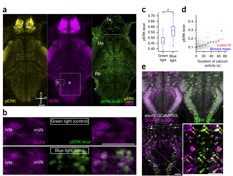 在这里,我们将介绍一种更加适用的内源性传感器:磷酸化ERK(也称为MAP)。响应于去极化、钙流入激活的Ras ERK通路后进而导致转录因子如CREB和Elk磷酸化和IEG的表达。因此,磷酸化的ERK1/2(pERK)可被用于定位活性的神经元并提高(IEGs)的时间分辨率至5分钟内。
