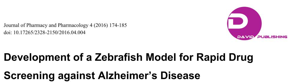 为了筛选有效的抗AD药物,能模拟AD病理过程的实验动物模型是必不可少的。长期以来,小鼠筛选系统一直占着阿尔茨海默氏病研究中的主导地位。近年来,斑马鱼模型引起了学者的极大关注,并由于成本效益被广泛使应用在实验中。例如,帕凯等人开发出了一直tau蛋白的转基因斑马鱼模型,用来定位tau蛋白磷酸化的化合物。而且斑马鱼模型能很好地识别出GSK3β抑制剂,如潜在AD靶向治疗药GSK3,就会导致斑马鱼胚胎脑部减小。然而,大多数的斑马鱼AD模型都是转基因品种,需要极大的时间和金钱成本,因此新的且能快速筛选抗AD药物的斑马鱼模型是及其有必要的。