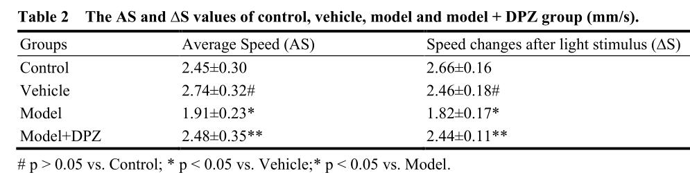 氯化铝是一种用于诱导啮齿类AD模型的标准化学品,用氯化铝可以减慢6-8个月的斑马鱼的游动速度,和AD患者的运动障碍现象十分相似,因此可以用氯化铝来诱导制造新的斑马鱼AD模型。之所以选择受精后3-5天的幼鱼,而不是先前所述的6-8个月的成鱼做实验是为了更好地进行高通量药物筛选并削减成本。以多奈哌齐(DPZ)为阳性药在实验中不断地对三个条件,即氯化铝暴露浓度、暴露周期和药物治疗浓度上对模型进行了优化后成功建模,并验证了该模型的可靠性和可重复性(表2)。
