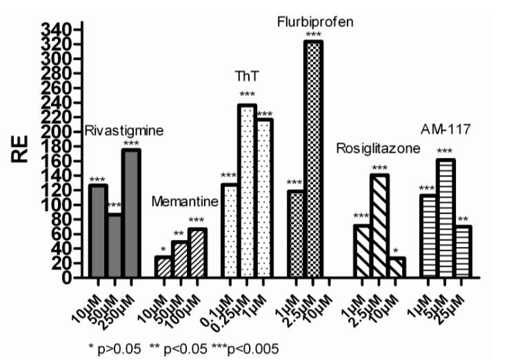 Aβ(淀粉样蛋白β)在AD的发病机理中发挥着重要的作用,而增加IDE(胰岛素降解酶)的水平会活化PPARγ受体进而促进Aβ在大脑中的降解。ThT是Aβ凝聚抑制剂,而氟比洛芬和罗格列酮,是被批准的非类固醇抗炎药和降血糖药,分别作为γ分泌酶抑制剂和PPARγ激动剂正处于临床试验中。