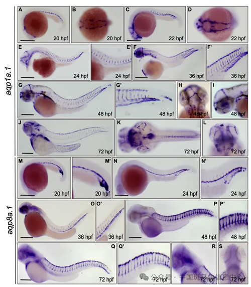 为了确定aqp1a.1和aqp8a.1在表达模式,研究人员通过全胚胎原位杂交(WISH)检测了两种基因在斑马鱼中的时空表达。结果显示,在胚胎发育过程中,aqp1a.1和aqp8a.1特异性地表达于斑马鱼血管系统。