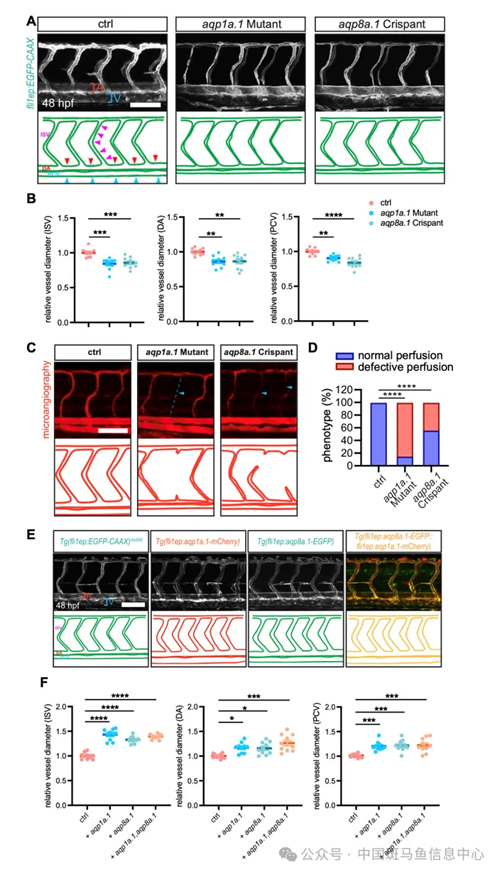 为了阐明aqp1a.1和aqp8a.1在血管系统中的功能,研究人员分别通过CRISPR/Cas9基因编辑手段构建了aqp1a.1/aqp8a.1基因敲除斑马鱼和Tol2转座子介导的转基因技术构建了aqp1a.1/aqp8a.1内皮细胞特异性过表达斑马鱼。结果显示,aqp1a.1/aqp8a.1敲除斑马鱼中血管表型与高血糖斑马鱼模型中的血管直径变细及灌注不良表型高度相似,且内皮细胞特异性表达aqp1a.1或aqp8a.1可显著恢复血管表型。
