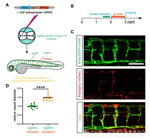 为了进一步阐明高血糖引起的血管狭窄是否与水通道蛋白相关,研究人员通过嵌合表达方式在斑马鱼部分内皮细胞中过表达aqp1a.1。如图所示,研究人员通过将pTol2-fli1ep-aqp1a.1-mCherry质粒和Tol2转座酶mRNA共注射到4细胞期的Tg(fli1ep:EGFP-CAAX)ntu666转基因斑马鱼胚胎。通过这种策略,mCherry标记的Aqp1a.1在斑马鱼血管系统中以嵌合方式表达。将嵌合体浸泡于高葡萄糖溶液构建高血糖模型,之后进行共聚焦成像观察。结果显示,表达Aqp1a.1的节间血管直径显著增大。