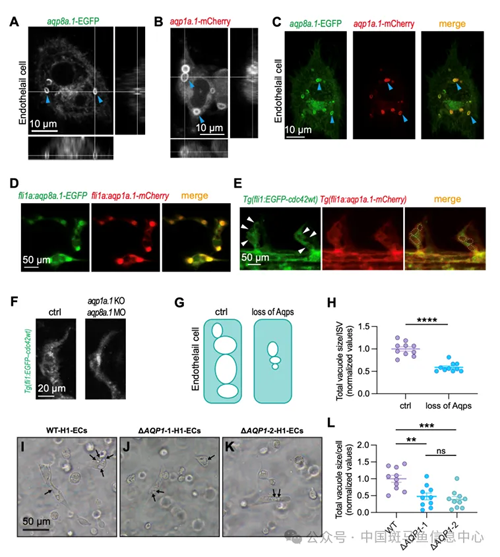 为了探索水通道蛋白是否通过细胞内囊泡融合机制参与血管管腔形成,作者分别通过体外细胞实验和斑马鱼在体实验进行进一步验证。作者发现,斑马鱼水通道蛋白aqp1a.1和aqp8a.1显著表达在人脐静脉内皮细胞内囊泡。通过对转基因斑马鱼活体成像也发现,与细胞内囊泡标志物cdc42共定位。同时,敲除aqp1a.1并敲降aqp8a.1导致斑马鱼节间血管中细胞内囊泡数量减少和总体积减小,且血管管腔形成被抑制。