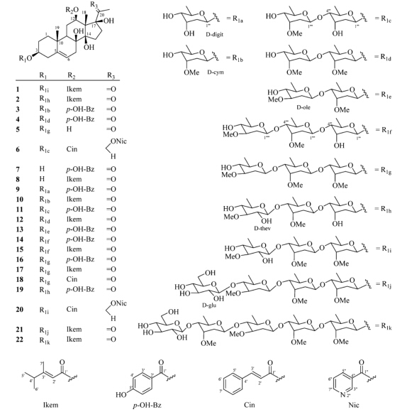 上海中科院和环特生物的研究员们,选取了六个新的C21甾体苷类化合物,被命名为cynotophyllosides A-F(1-6)联合从青阳参的根部分离得到的16个已知化合物(7-22)开展了实验,并将结果发表在了Natural products杂志上。经光谱和化学分析确定了新型化合物的主要组成成分,其中有三个化合物otophylloside F (15),otophylloside B (17)和rostratamine 3-O-β- D -oleandropyranosyl-(1→4)-β- D -cymaropyranosyl-(1→4)-β- D -cymaropyranoside (18)对癫痫斑马鱼的运动起到了显著的印制作用。初步构效分析表明,带C-12酯基的孕甾烯骨架结构(ikemaoyl > cinnamoyl > hydroxy > p-hydroxybenzoyl)和一个由三个2,6-dideoxysaccharide的糖链结构是活性部位。