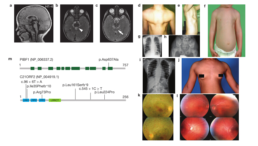 纤毛疾病是由于细胞中纤毛或指状样的突出物缺失而引起的,这些突出物在细胞中起着“微型天线”的作用,检测细胞外部液体流量以及化学信号的改变后,再产生相应的应答反应;肾脏疾病就是一种常见的纤毛疾病的并发症,通常会引发肾衰竭。下图为PIBF1或C21orf2基因突变时的纤毛疾病患者的临床表现,主要体现在a-c,PIBF1突变后,出现脑梗和小脑发育不良;d-j,C21orf2突变,出现胸廓畸形,骨盆发育不良,眼盲等症状。