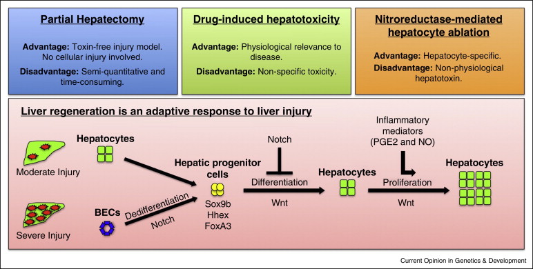 科学家们还通过三种不同的肝损伤模型来研究肝细胞再生的调控机制,分别是:部分肝脏切除模型(partial hepatectomy),药物诱发的肝毒性模型(drug-induced hepatotoxicity)和硝基还原酶介导的肝细胞消融模型(nitroreductase-mediated hepatocyte ablation)。经过大量的实验验证后发现:1)在肝损伤后的再生修复过程中,Wnt和Notch通路起着十分重要的作用;2)炎症调控因子在肝细胞增殖中发挥着重要调节作用;3)在中度肝损伤中,肝细胞再生是从肝细胞分化开始;而在重度肝损伤中,肝细胞再生是从胆管上皮细胞分化开始的(详见下图)。