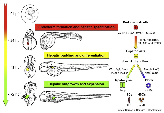 斑马鱼肝脏的正常发育过程从形态学上可以分为以下几个阶段:1)内胚层细胞的肝脏特化(hepaticspecification),2)肝脏萌芽和肝细胞分化(hepatic budding and differentiation)3)肝脏发育(hepaticoutgrowth)。详细发育过程以及相关调控基因详见下图(BECs:胆管上皮细胞),研究发现很多影响人体肝脏发育调控基因的化合物都会影响斑马鱼的肝脏发育。