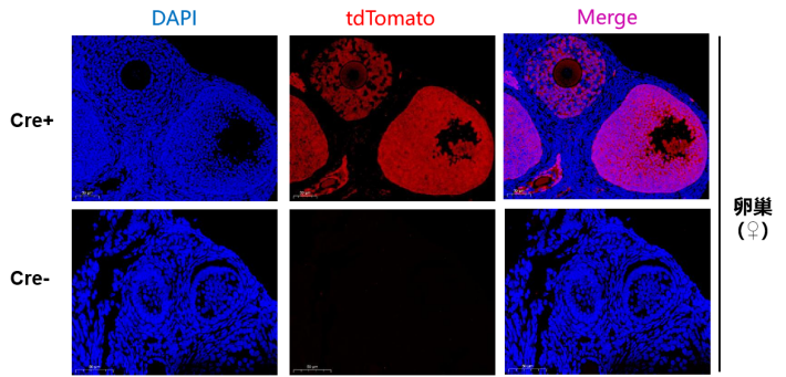 Cre+(Cyp19a1-IRES-Cre[KI/+]; Rosa26-LSL-tdTomato[CKI/+])雌性小鼠在卵巢颗粒细胞中存在大量的tdTomato蛋白红色荧光,表明在该部位存在大量的Cre重组酶表达,而对照组(Cre-)小鼠中检测不到tdTomato红色荧光的表达,不存在Cre重组酶的表达。
