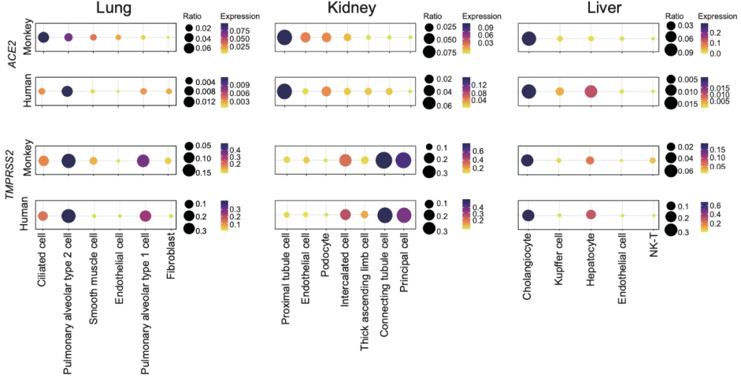 该研究基于上述单细胞数据库,系统分析了新冠病毒受体ACE2及其辅助蛋白酶TMPRSS2在食蟹猴44种细胞类型上的表达情况,发现ACE2主要表达在肺,肾脏,肝脏的上皮细胞,而在血液和大脑皮层组织中几乎不表达。通过对ACE2在44种细胞中表达比例的排序,发现了各个器官中新冠病毒易感的细胞类型。