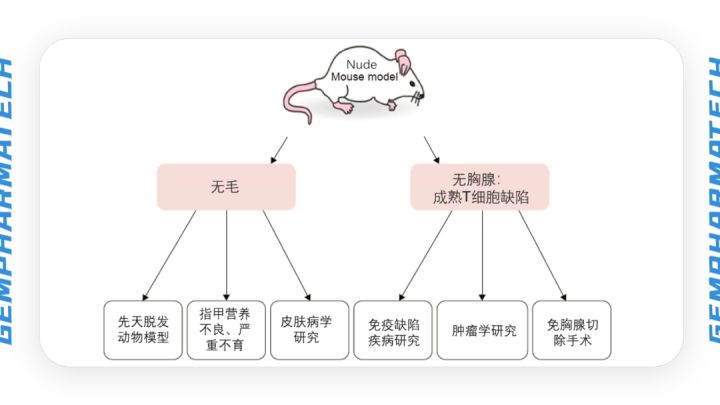 根据自发突变(Foxn1nu)的纯合体裸鼠的两个主要缺陷,自发突变的纯合体裸鼠可以应用于以下包括Foxn1nu相关的领域: