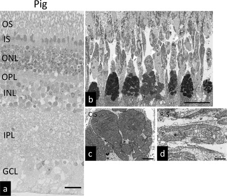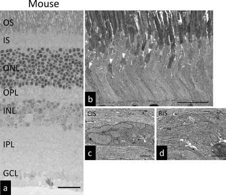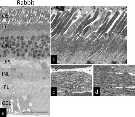 以前报道过猪视网膜含有巨线粒体。由于哺乳动物光感受器细胞中存在巨线粒体的报道很少,我们用扫描电子显微镜(SEM)评估了猪、兔和小鼠的视网膜形态。为了获得宽视场的高分辨率图像,我们采用了独特的扫描电镜方法。在传统的SEM中,不需要嵌入和切片步骤,而仅查看标本的表面。相反,我们的SEM技术包括将单个或连续的超薄切片安装在载玻片上,被重金属染色以及扫描反向散射的电子。通过数字化“缝合”连续的SEM图像,可以以高分辨率获得宽视场图像。图1a显示了猪视网膜的电镜图像。图1b为猪光感受器细胞层的电镜图像。图1c为图1a中视锥节的放大图,图1d为图1a中视杆节的放大图,图2a为兔视网膜的电镜图像。图2b为兔光感受器细胞层的电镜图像。图2c显示了图2a中视锥节的放大视图。图2d显示了图2a中的视杆节的放大视图。图3a显示了小鼠视网膜的电子显微镜图像。图3b所示为小鼠感光细胞层的电镜图像。图3c示出了图3a中的视锥节的放大图。 图3d示出了图3a中视杆节的放大图。OS:外节,IS:内节,ONL:外核层,OPL:外丛状层,INL:内核层,IPL:内丛状层,GCL:神经节细胞层。 CIS:视锥光感受器节。 RIS:视杆感光器节。