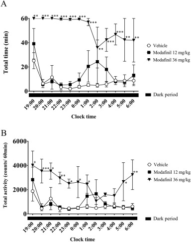 图4.在黑暗期,注射莫达非尼的食蟹猴(n = 3)的每小时清醒时间(A)和运动活动计数(B)。