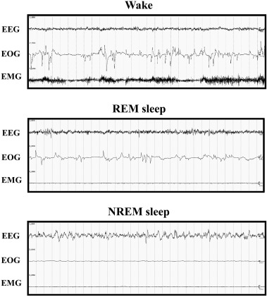 使用SleepSign软件分析了遥测系统记录的数据。 唤醒状态的持续时间被分为1小时的增量。在30-s的时间段内,猴的警戒状态被确定,并被确定为三种不同的状态:觉醒、NREM睡眠和REM睡眠。觉醒的特征是低振幅、高频率的EEG活动伴随着高振幅的EOG和EMG活动。在睡眠状态下,脑电波活动的脑电图记录显示NREM睡眠的特征是非常缓慢但相对较高的振幅或高压振荡(随着睡眠的加深,频率逐渐减慢,振幅逐渐增大),而REM睡眠具有更快和更低的振幅轨迹,类似于正常的清醒活动。肌电图对骨骼肌活动的跟踪显示,尽管在快速眼动睡眠期间身体有效地处于静止状态,但在快速眼动睡眠期间身体确实做出了有限的运动。EOG显示NREM睡眠时很少或没有眼球运动,REM睡眠时眼球运动迅速。