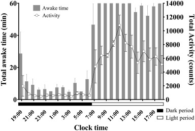 我们比较了在服用三唑仑后使用多导睡眠描记术测量的单位时间清醒时间和使用纳米标签测量的单位时间运动活动计数的变化。证实,在12小时的光照期间,觉醒占主导地位。