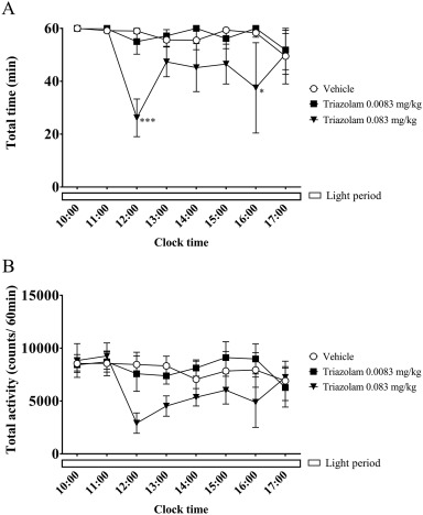 图5.在光照期间,注射三唑仑的食蟹猴(n = 3)的每小时清醒时间(A)和运动能力计数(B)。