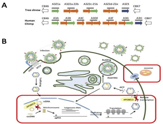图1. 树鼩APOBEC3的基因模式以及抗病毒图示意图。 (A) 树鼩APOBEC3有5个家族基因;(B)树鼩APOBEC3能够通过基因编辑作用限制HBV的复制;HBV的X蛋白能够促进外泌体形成外排APOBEC3,从而降低胞内APOBEC3的水平来促进病毒复制。