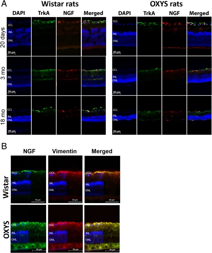 在类AMD视网膜病变的衰老和发展过程中,大鼠视网膜中的NGF和TrkA表达。 在不同年龄的OXYS和Wistar大鼠(n = 4)的视网膜中mNGF(红色)和TrkA(绿色)的双标记免疫荧光染色。18月龄OXYS和Wistar大鼠视网膜波形纤维蛋白(红色)和mNGF(绿色)的双标记免疫荧光染色。在AMD样视网膜病变的晚期,波形纤维蛋白表达增加。 在OXYS视网膜中,波形纤维蛋白和mNGF具有良好的共定位性。DAPI染色细胞核呈蓝色。缩写:GCL,神经节细胞层;INL,内核层;ONL,外核层