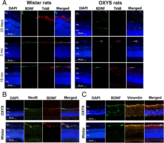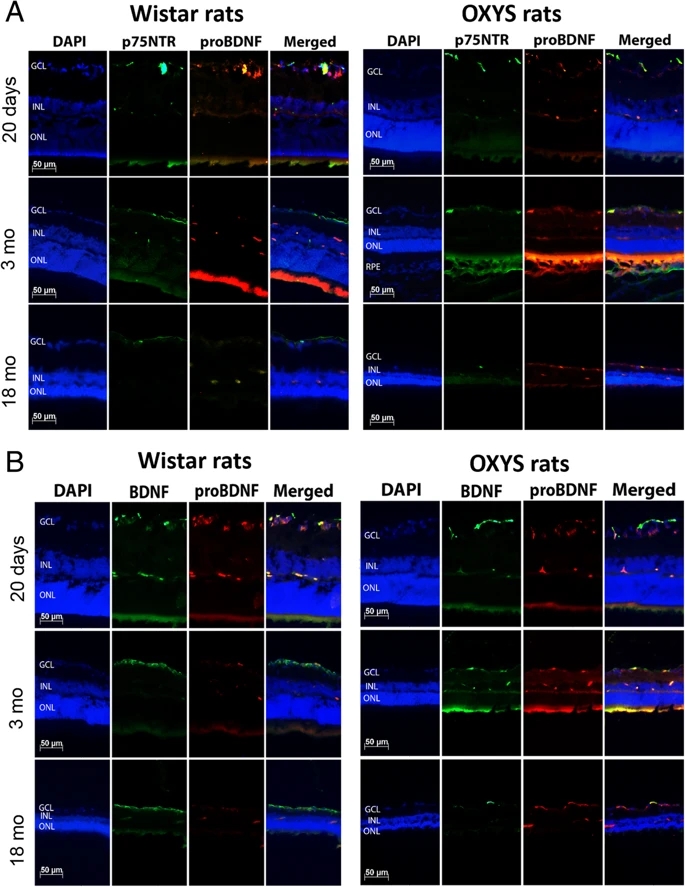 方法:采用临床前期(20 天)、早期(3 个月)、晚期(18 个月)的雄性OXYS大鼠和年龄匹配的雄性Wistar大鼠(作为对照)。我们用荧光显微镜在OXYS和Wistar大鼠视网膜切片上对NGF、BDNF及其受体TrkA、TrkB和p75NTR进行了免疫组化定位。