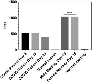 此外,我们使用HRP标记的抗人IgG-Fc和HRP偶联的小鼠抗人μ链同型特异性次级抗体来重新检测血清中IgG和IgM的水平。第8天仅在雌性猕猴中观察到抗S1 IgG抗体。在第15天,两种猕猴体内都检测到了很强的抗S1-IgG滴度,同时也检测到了IgM水平。有趣的是,在第22天再次S1-Fc增强免疫后,第32天仅抗S1-IgG滴度大幅增加,同时未观察到明显的抗S1-IgM滴度。使用相同的ELISA分析,我们检查了从COVID-19患者不同天采集的血浆样品中抗S1 IgG和IgM抗体的水平。在疾病发作后4天可以检测到IgG抗体,并且在第12天滴度增加,但在第20天滴度显著降低。