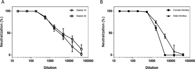 图5、S1-Fc免疫兔和猴抗血清的假病毒中和活性。
