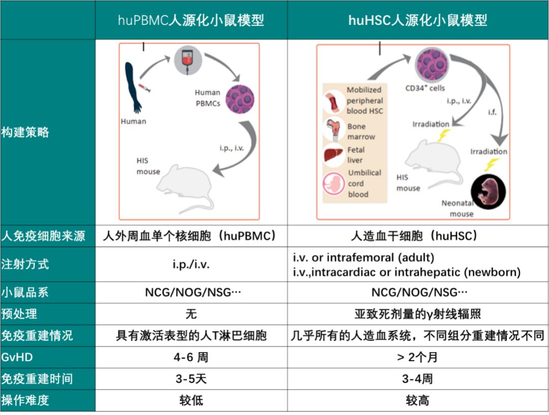 图1 huPBMC与huHSC人源化小鼠模型的特征比较[2]