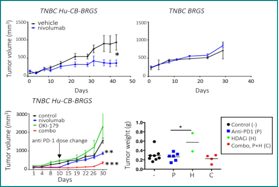 通过huHSC人源化BRGS(BALB/c-Rag2nullIl2rγnullSIRPαNOD)小鼠中构建三阴性乳腺癌PDX模型就很好地解决了BRGS小鼠本身无法评估PD-1抗体药物Nivolumab(Opdivo)的难题。与此同时,huHSC人源化BRGS结合MDA-MB-231细胞CDX模型也可以用于PD-1抗体药物Nivolumab与HDAC抑制剂OKI-179的联用作用评价,指导临床药物组合探索 [4]。