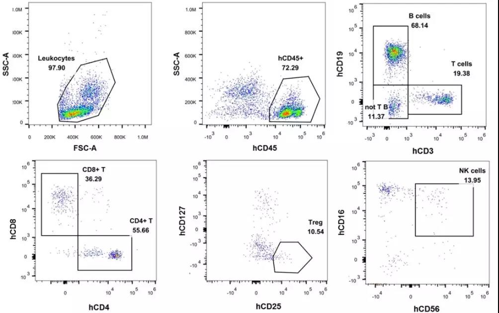 图5 huHSC-NCG人源化小鼠快速重建人免疫系统,可检测到多种人源免疫细胞,如T细胞,B细胞及NK细胞等,仍然以T细胞为主