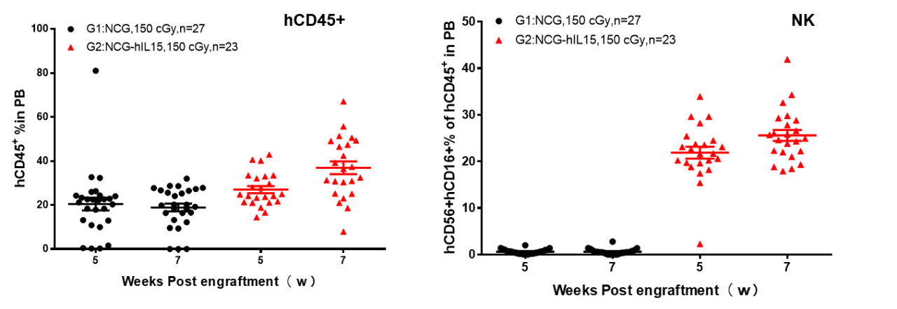 图6 huHSC-NCG-IL15人源化小鼠在快速重建人免疫系统的同时,可大幅提高其中NK细胞重建比例