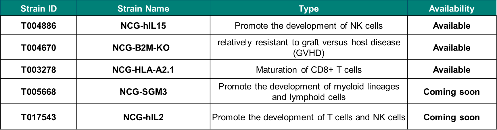 huHSC-NCG二代小鼠选择多,解决huHSC-NCG一代小鼠中功能性NK细胞、髓系细胞重建难题,为针对其他免疫检查点及免疫细胞的新一代免疫疗法评估创造可能。