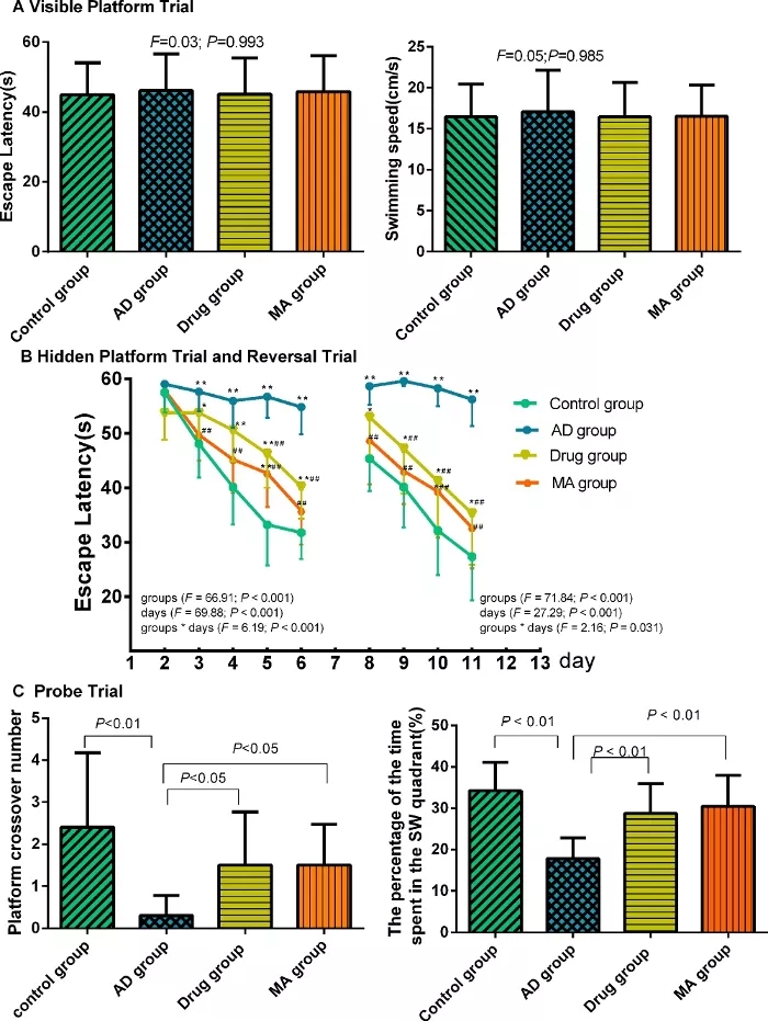 这里以Jove上一篇文章中的结果作为例子,分组(具体什么转基因小鼠就不说了),前三个很常规,分别是对照组(阳性对照),AD组(阴性对照)和用药组,还有MA(Manual Acupuncture)组是针灸组,这个实验目的大概是看看针灸是不是能达到用药的效果。