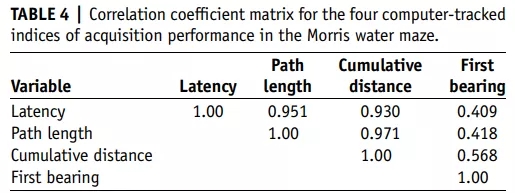 在这里可以根据前人的研究发现,水迷宫平台隐藏期的寻找平台的所需时间、路径长度以及与平台的距离三者之间是高度相关的。而首次游动方向则与前三者相关性较弱,因此一般我们在文章中最多只需要列出前三个数据就可以说明问题了。