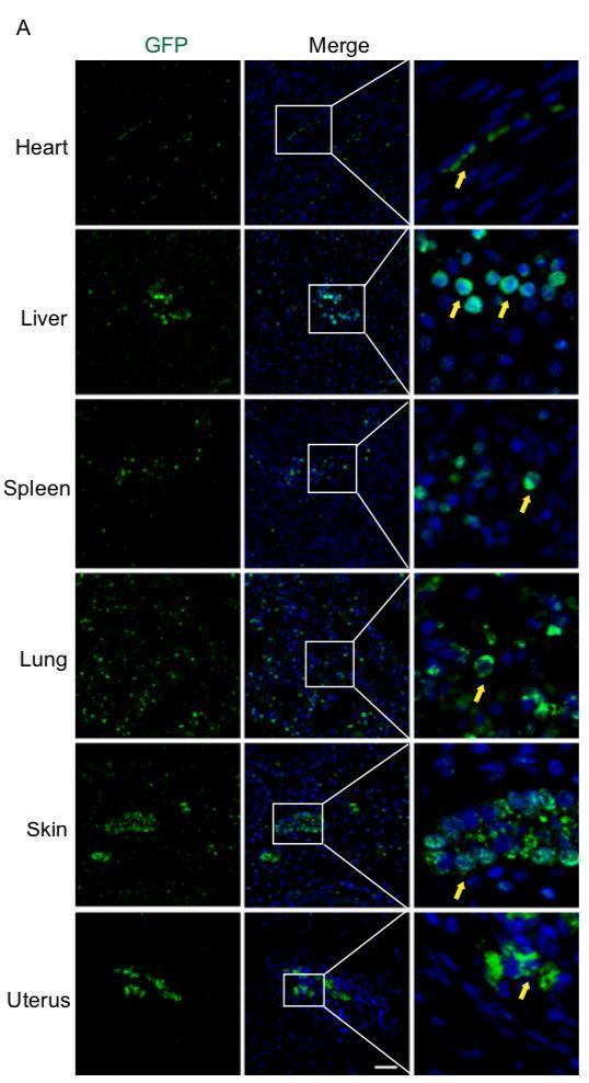 图 | 嵌合体活产猪的心脏、肝脏、脾脏、肺、皮肤和子宫中绿色荧光蛋白的免疫荧光图像。(来源:《蛋白质与细胞》)