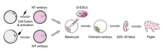 制备嵌合体大都用显微注射,也就是通过显微操作将目的干细胞注入猪的早期胚胎中。