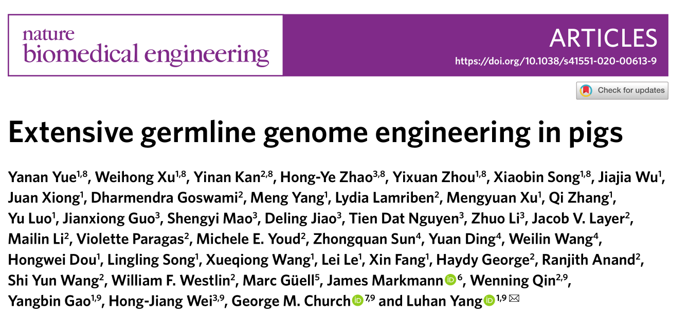 2020年9月21日,Nature Biomedical Engineering上发表题为Extensive germline genome engineering in pigs的文章,杨璐菡博士带领的研究团队成功地做出了第一代可用于临床的异种器官移植雏形——“猪3.0”,加速了做出和人类免疫兼容的细胞和器官产品的进程,创造出第一个独特的临床异种器官移植雏形:其同时具备了去除猪内源性逆转录病毒(PERV)及增强异种器官的免疫兼容性两个功能。