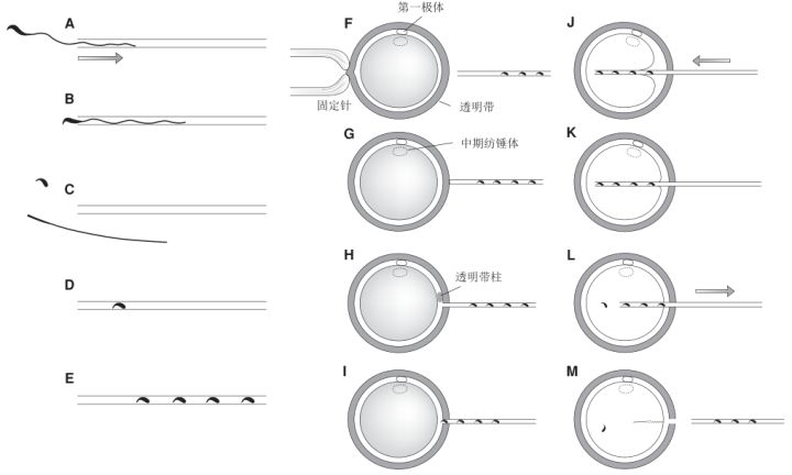 注:(A,B)从精子的尾巴开始将精子吸入注射针;(C)压电脉冲分离精子的头部和尾部;(D,E)多个精子头部被按顺序吸入注射针内;(F)用固定针固定卵母细胞并准备好注射针准备注射;(G,H)注射针推进透明带形成一个透明带柱,随后透明带柱被推到卵黄膜周边;(I,J)继续将注射针推入卵母细胞.;(K)注射针的压电脉冲刺穿卵母细胞质膜;(L) 将精子头部注射入卵母细胞质;(M)随后撤出注射针