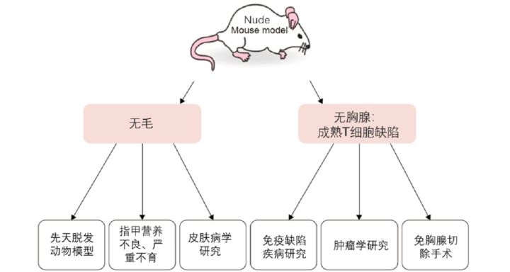 1996年研究发现,裸鼠是由于第VIII连锁群内裸体位点Foxn1基因点突变,编码蛋白提前终止而形成一截短的无功能蛋白所致,其纯合体裸鼠有两个主要的缺陷:毛发生长不正常和胸腺上皮细胞发育不全。Foxn1(Forkhead box N1)基因又称Hfh11、Fkh19,由该基因编码的蛋白质是叉头家族或“翼状螺旋”转录因子的一部分,称为叉头框蛋白N1。Foxn1蛋白是在胸腺上皮细胞中表达的蛋白质,是一种转录因子,其在发育过程中,参与免疫系统调节、代谢,在癌症和衰老中发挥重要的作用。该基因家族有100多个成员,编码的蛋白质主要是调节胸腺的发育和角化细胞的分化,Foxn1参与T细胞成熟和调节基因及抗原的表达。Foxn1的自发突变导致裸鼠缺乏成熟的胸腺和T细胞,同时由于缺乏与T细胞的密切接触,裸鼠的B细胞发育也严重受影响,但是体内仍残留一些有功能的免疫细胞,其独特的遗传特性,使得在活体实验动物中研究人类肿瘤成为现实。