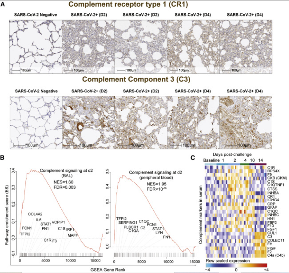 血小板活化与SARS-CoV感染:与未感染的对照组相比,SARS-CoV-2感染后第2天和第4天,恒河猴的肺脏切片显示补体途径关键成分的表达增加,包括补体受体1(CR1)和C3。对感染的猕猴的BAL和外周血进行的转录组学分析类似地显示了BAL和外周血中1-4天补体途径的上调,包括补体标记物C1R,C1S,C1QA和C1QC、 ficolin标记; 组织因子F3;纤维连接蛋白FN1。我们进一步通过蛋白质组学验证了血清中补体级联的上调,,这表明血清中多种补体成分和补体级联水平增加,包括C1R、C1QC、C3b/C4b受体1(CR1)、C3和凝血因子II、V、IX和X(F2、F5、F9和F10)。