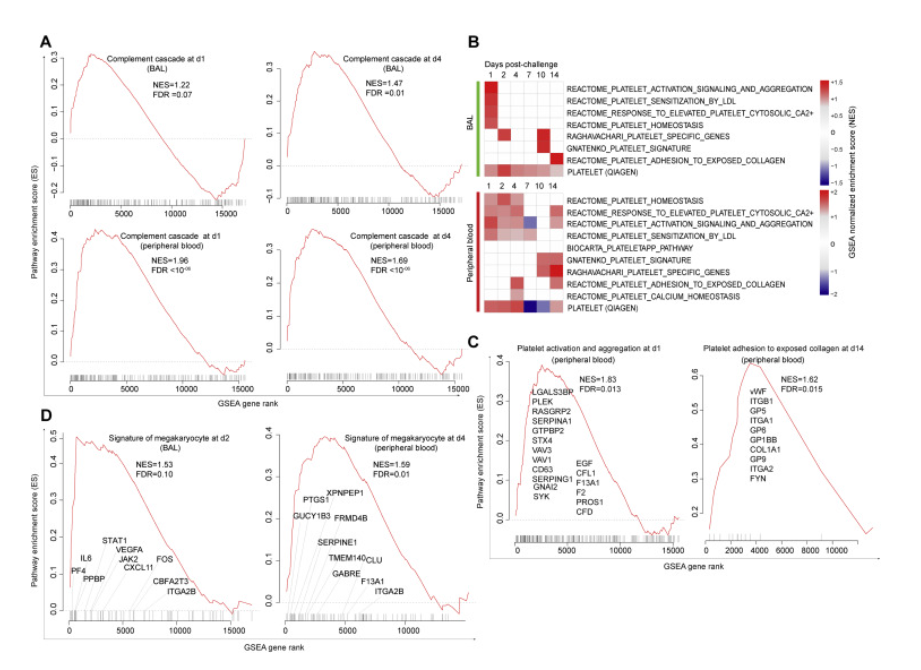 图S7、SARS-CoV-2感染增加了被感染猕猴BAL和外周血补体信号、血小板活化和粘附以及巨核细胞的表达。