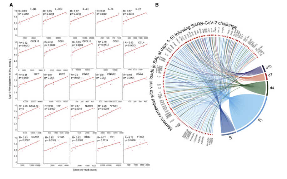最后,我们的分析显示,SARS-CoV-2增加的固有免疫标记物的表达水平与BAL的病毒载量呈正相关,包括细胞因子和炎症标志物(IL-6R、IL1RN、IL-10、CXCL10、TNF、NFKB1和NLRP3)、ISG(IRF7、IFT1和MX1)、IFNα基因(IFNA2、IFNAR2和IFNA4)和血栓形成相关标志物(C1QA, C3AR1, THBD, 和FN1).。这些标记物也与激发后1-10天BAL的病毒载量呈正相关。值得注意的是,这些标记物的表达在第10-14天恢复到正常水平,与猕猴从感染中恢复相一致。