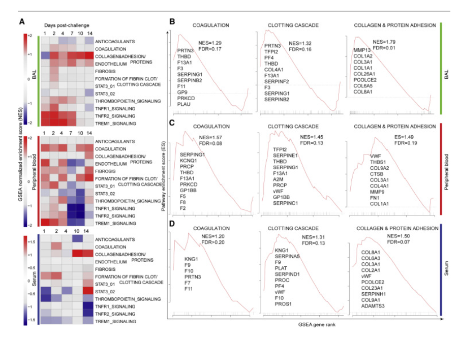 GSEA显示感染的猕猴的BAL、外周血和血清中与凝血、血栓形成和血管疾病相关的转录组和蛋白质组学特征显著丰富。在BAL,外周血和感染猕猴的血清中,凝血和凝血级联的途径在第1-14天增加,包括凝血和组织因子,凝血级联的标志物以及与细胞外基质降解有关的金属蛋白酶基因。血栓调节蛋白(THBD)是与凝血酶结合的内皮特异性I型膜受体,F13A1编码凝血因子XIIIA。此外,胶原蛋白是通过各种机制(包括与vWF结合)响应组织损伤的血小板活化和聚集的主要介质之一。我们观察到BAL、外周血和血清中胶原和蛋白质粘附标记物显著增加,而vWF仅在激发的猕猴的外周血和血清中上调。这些转录组学和蛋白质组学结果证实了我们的组织病理学和免疫组化(IHC)数据。BAL,外周血和被感染猕猴的血清中上调了先前在严重炎性疾病患者中报告的其他与血栓形成相关的标志物,凝血因子和HIF1α信号通路。此外,感染猕猴的BAL、外周血和血清中血小板活化、聚集以及细胞外基质组织(COL1A1、COL1A2、FN1、PF4、IGF1和ADAM15)的标记物也增加。