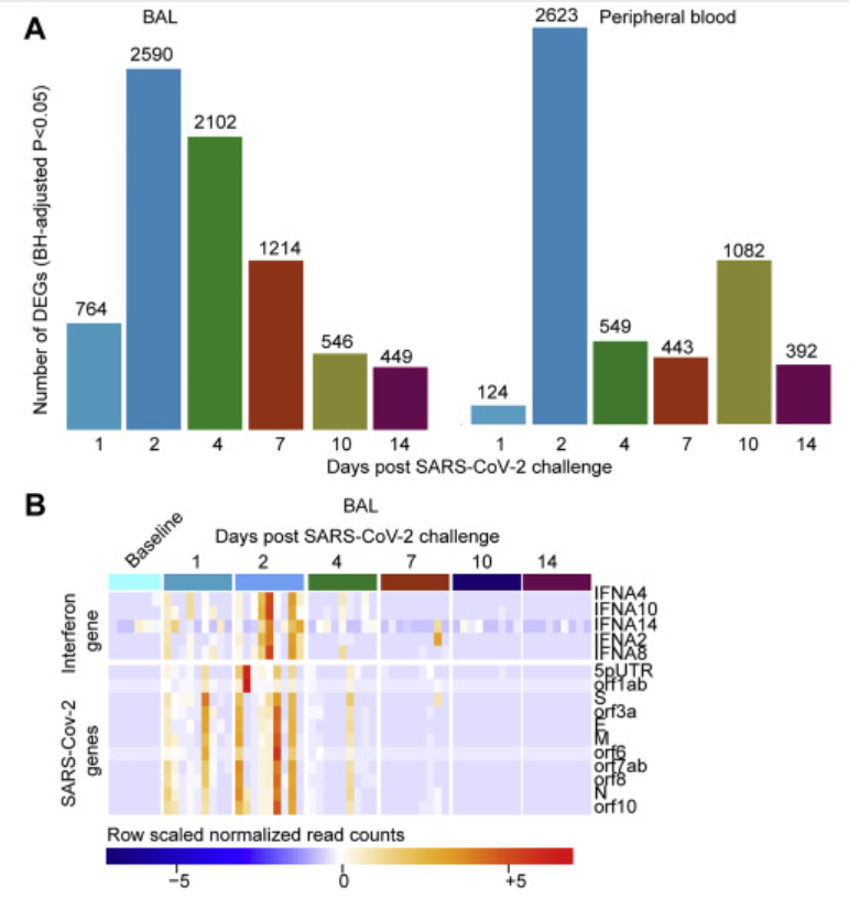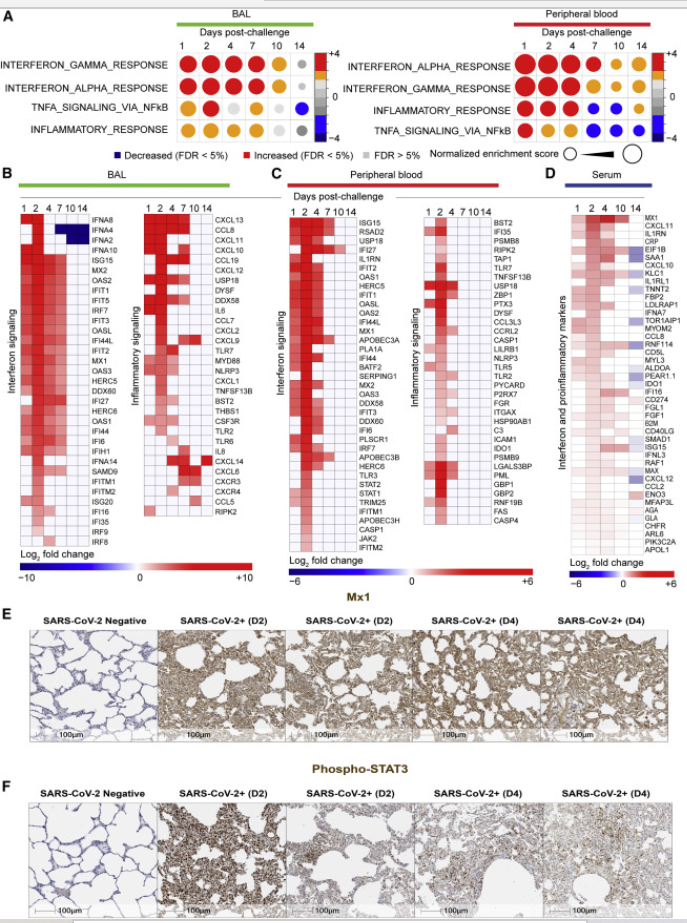 图3、SARS-CoV-2对感染猕猴BAL和外周血中干扰素和炎症途径的影响