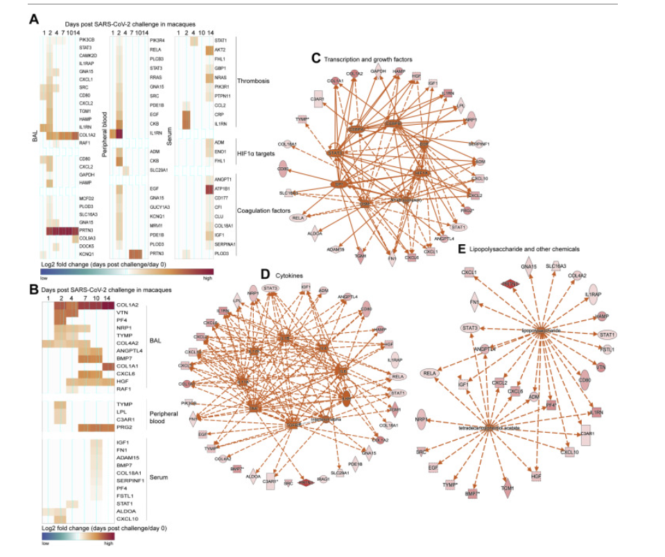 SARS-CoV-2感染可快速诱导血栓形成激活因子的分子特征:为了确定SARS-CoV-2感染激活的关键生物学过程和途径,我们在第1、2、4、7、10和14天对BAL和外周血样本以及血清蛋白质组学进行了RNA-seq转录组学分析。来自BAL和外周血的数据显示,在第1-4天表达升高的基因在第14天已基本恢复正常,包括干扰素和SARS-CoV-2转录本。
