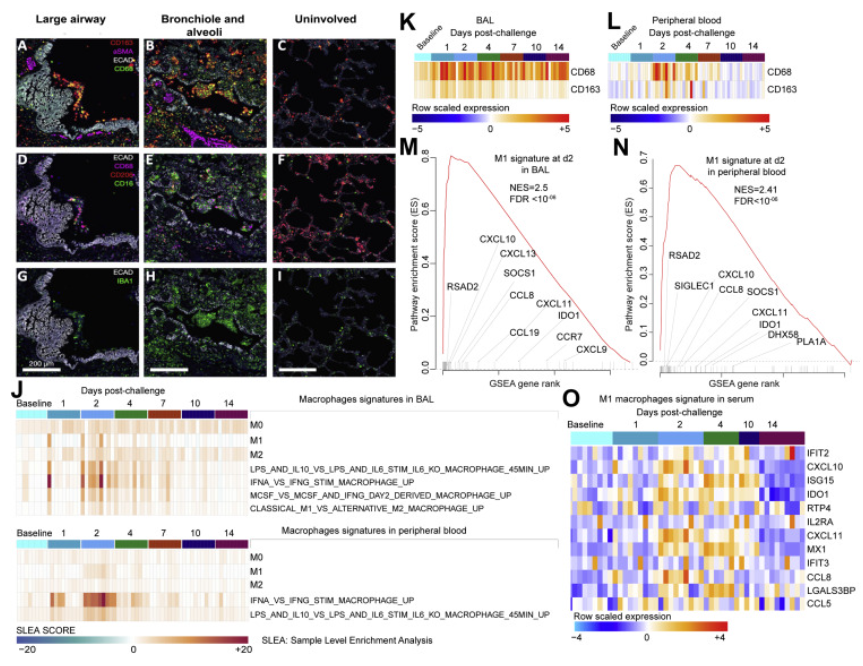 图5、多重cycf免疫荧光图像显示SARS-CoV-2激发猕猴肺部的巨噬细胞以及感染猕猴BAL、外周血和血清中的巨噬细胞转录特征