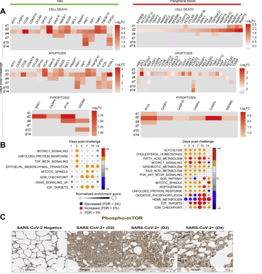 图S6、感染SARS-CoV-2的猕猴的BAL和外周血中细胞死亡,凋亡和代谢的分子特征增加。