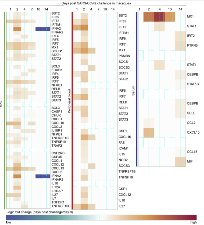 图4、SARS-CoV-2对感染猕猴BAL、外周血和血清中细胞因子和趋化因子的上调或下调。
