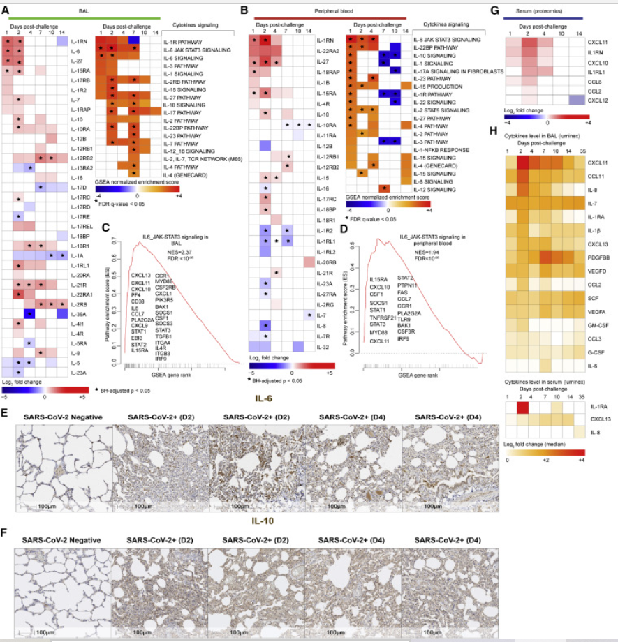 血清中C反应蛋白(CRP),IFNA7,ISG15,MX1和IDO1等的血清蛋白水平验证了SARS-CoV-2在猕猴中炎症和ISGs标记的上调。使用免疫组织化学,我们进一步验证了MX1的上调,MX1是干扰素诱导的蛋白,对多种RNA病毒和磷酸化STAT3(pSTAT3)具有抗病毒活性,并被多种细胞因子和生长因子(包括IL-6)激活。转录组分析显示BAL和外周血细胞因子及其下游信号通路显著增加,包括IL-1RN、IL-6、IL-8、IL-4、IL-10、IL-27、IL-18、IL-15、IL-12和IL-17。