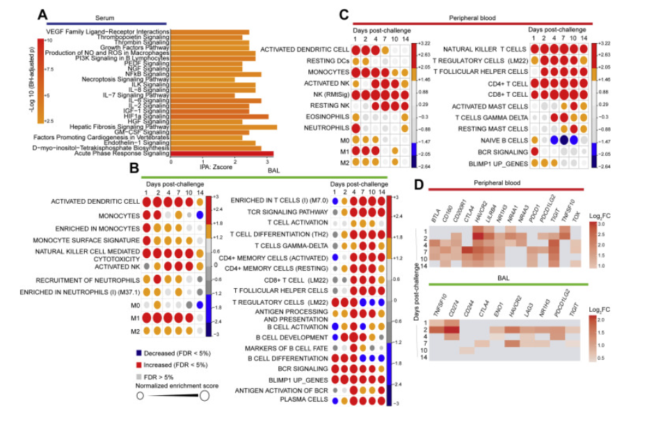 图S5、感染SARS-CoV-2的猕猴血清、BAL和外周血中细胞因子信号、先天性和适应性免疫细胞群以及免疫衰竭的特征增加